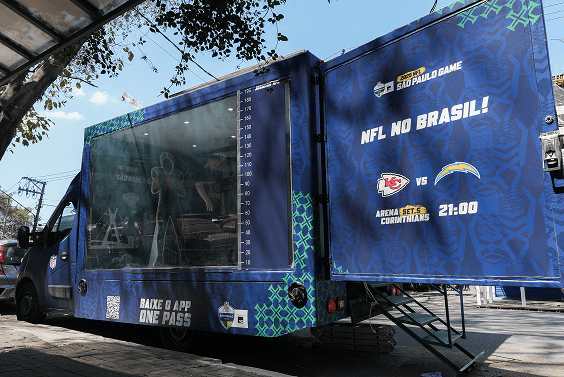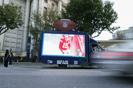 No teto externo do truck, uma bola oficial da NFL em tamanho gigante reforçava a paixão pelo esporte. Além disso, nosso truck de mídia rodou a cidade com 3 painéis de LED, espalhando a energia do futebol americano por todos os cantos.